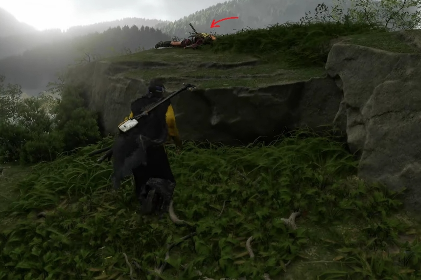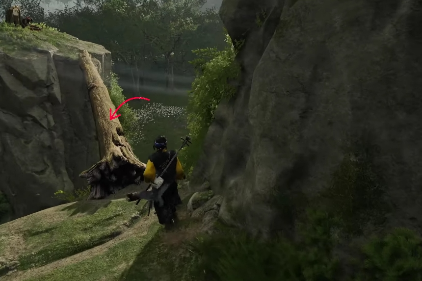 Next, follow the path around the column, hopping across branches and ledges. You’ll eventually come to a log connecting to another stone column, where you’ll notice another corpse.