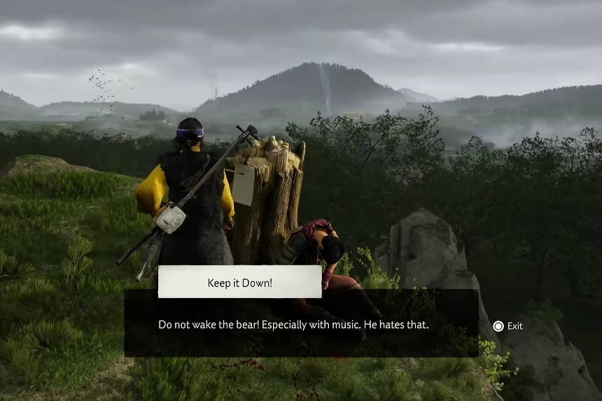 Take a moment to examine the note attached to the stump, it suggests keeping quiet, especially when music is involved. Pull out your shamisen and play Atsu’s Song. This triggers a short scene where an angry figure (disguised as a bear at first) warns you to stay quiet.