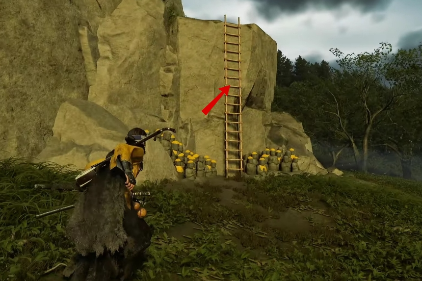 This altar appears to be close to the Stone Spire Hideout, and the ladder leading up appears to be unreachable. The answer is not that you jump straight up; it involves using the environment and a couple of corpses as markers.