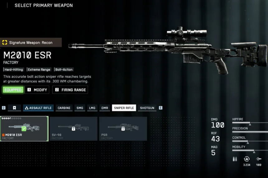 Pick any high-powered bolt-action sniper rifle you’re comfortable with. The M2010 ESR is an ideal choice because of its clean scope and predictable bullet drop.