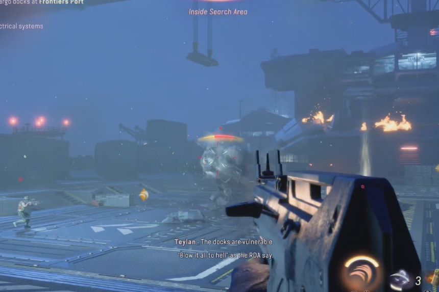 Once you reach the deck, Teylan will tell you how it’s swarming with RDA and Hellhounds. The good news is that Teylan will eventually get into their security system and flip them over so that they start attacking each other. All you have to do here is participate in destroying the RDA cargo docks and wait for Teylan to come out from inside the ship. Your mission is to successfully destroy the fuel silos, control tower electrical systems, and parked aircraft on the deck while dealing with enemies.