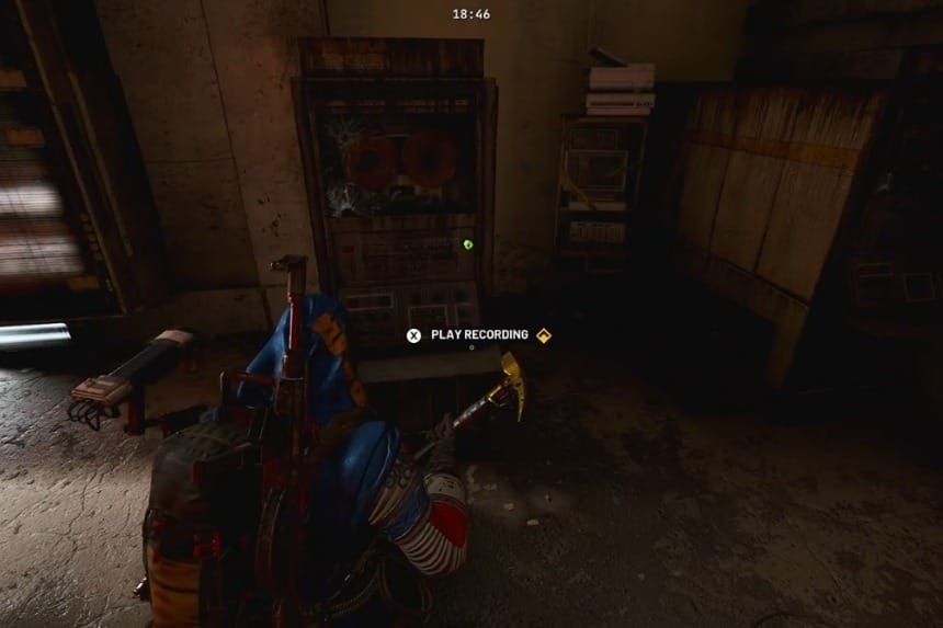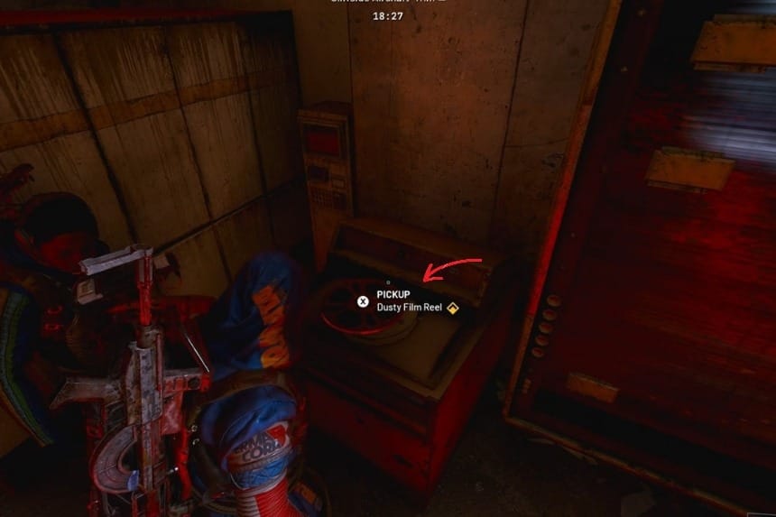 Once the door is unlocked, go to the very back of the room to find the huge screen, and to its right, you’ll find a computer of sorts. Interact and hit “Play Recording.” After this, look to the left of the screen, and you’ll find a container. Interact with it to get the Dusty Film Reel.