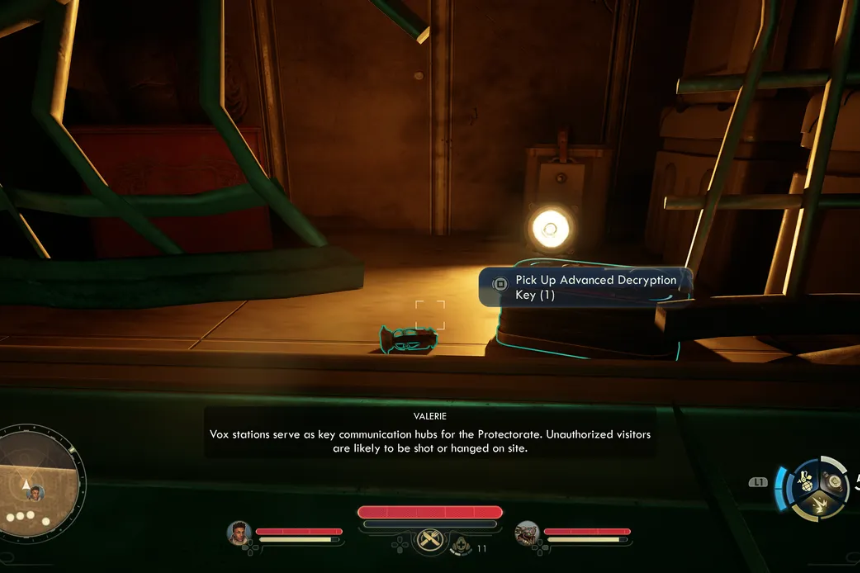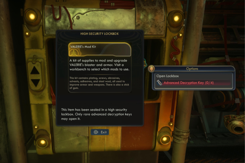 Your second objective is to access the High-Security Lockbox, where VALERIE’s Mod Kit is stored — blaster and armor upgrade module.