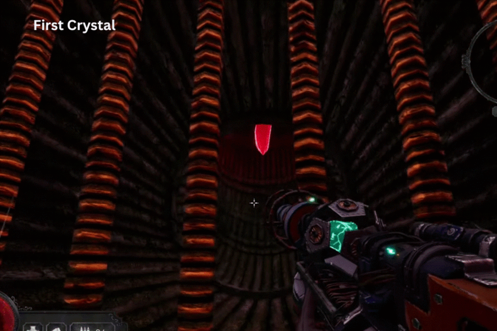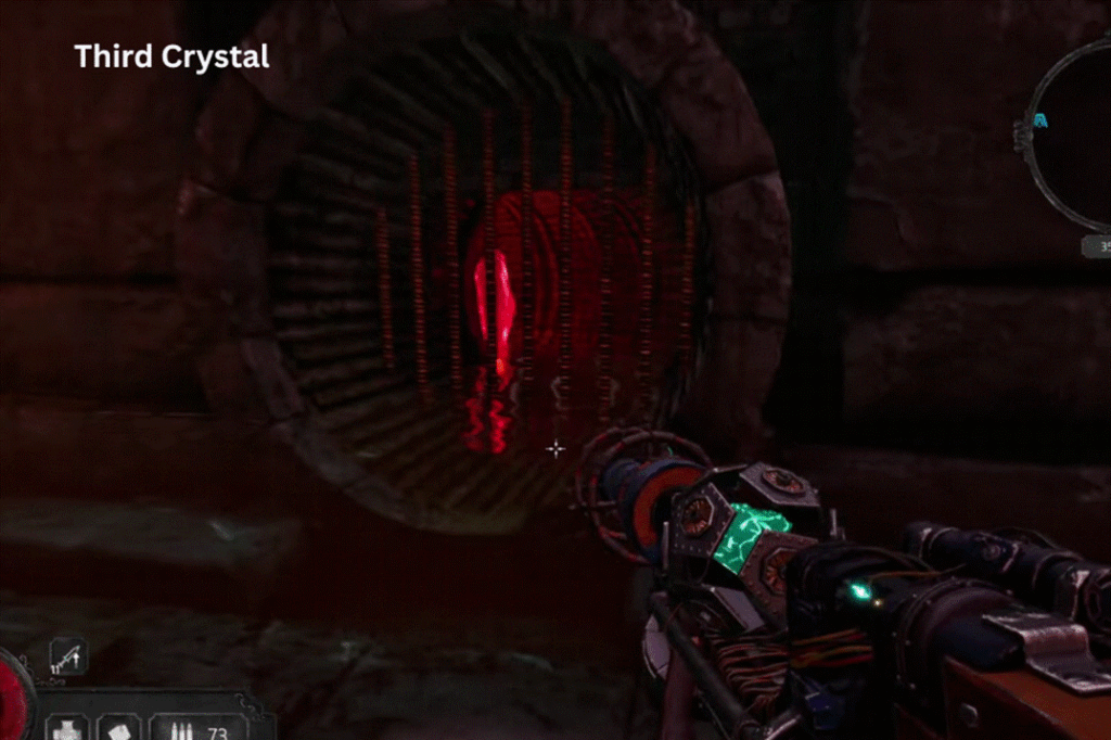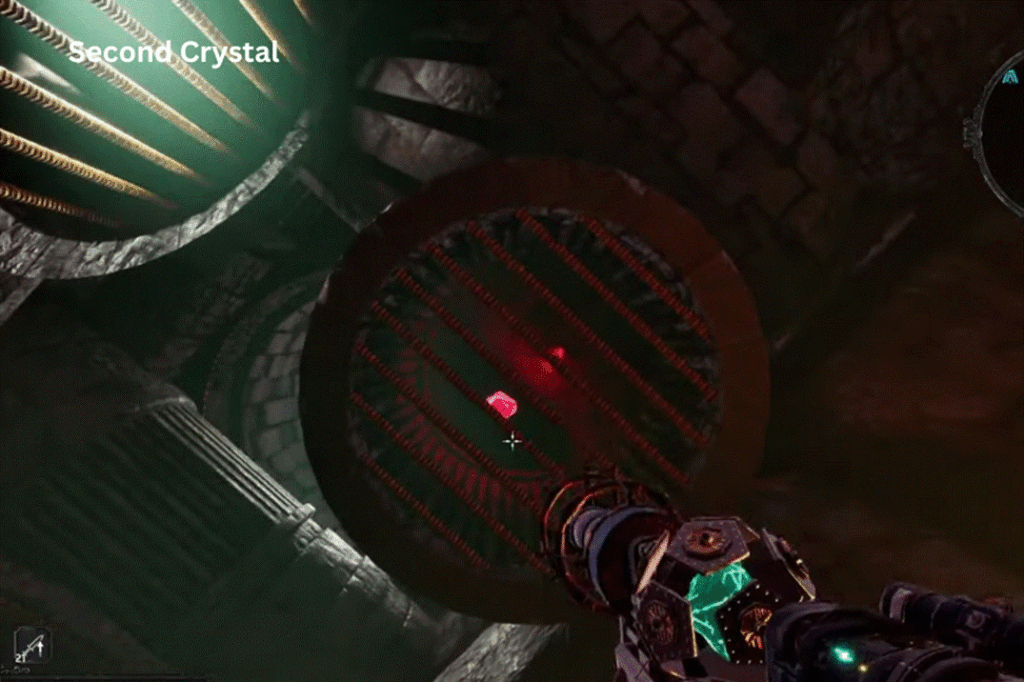 The first one is hidden a little to the left of the red door behind a grate. Look up to see the second crystal in the upper grate. The third crystal is to the right, deep inside another grate, near a small pond. Finally, the fourth one is placed in a vertical grate next to the exit tunnel.