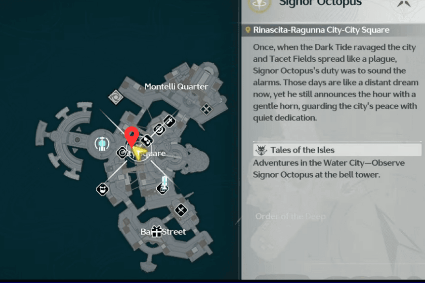You’ll find two Signor Octopus Echos perched on the towers in Raguuna City Square. While you can interact with them, it won’t unlock the Adventures in Water City entry. Instead, climb the archways that connect the towers and stand in the highlighted spot. You’ll then receive a prompt to ‘Observe Signore Octopus,’ which will complete the entry.
