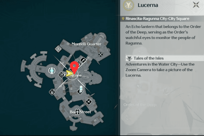 Lucerna can be a bit tricky to spot, but it’s actually quite simple to find. Stand beneath the main archway that leads into Raguuna City Square and look for the ‘Observe Lucerna’ prompt. Once you see it, simply take a photo of Lucerna with your Zoom Camera.