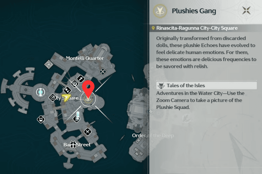The Plushie Squad can be found right behind Lucerna, near the fountain in Raguuna City Square. You’ll hear their music as you approach, and you’ll see a prompt to stand near the ground. Observe the Plushie Squad and take a photo of them with your Zoom Lens to add them to your collection.