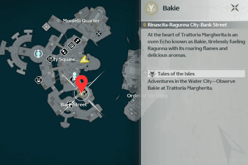 You can find Bakie at Trattoria Margherita, a local pizza place. She’ll be busy helping prepare delicious food. You’ll interact with her during the story, but you can also find her by following the fork and knife symbol on your map.