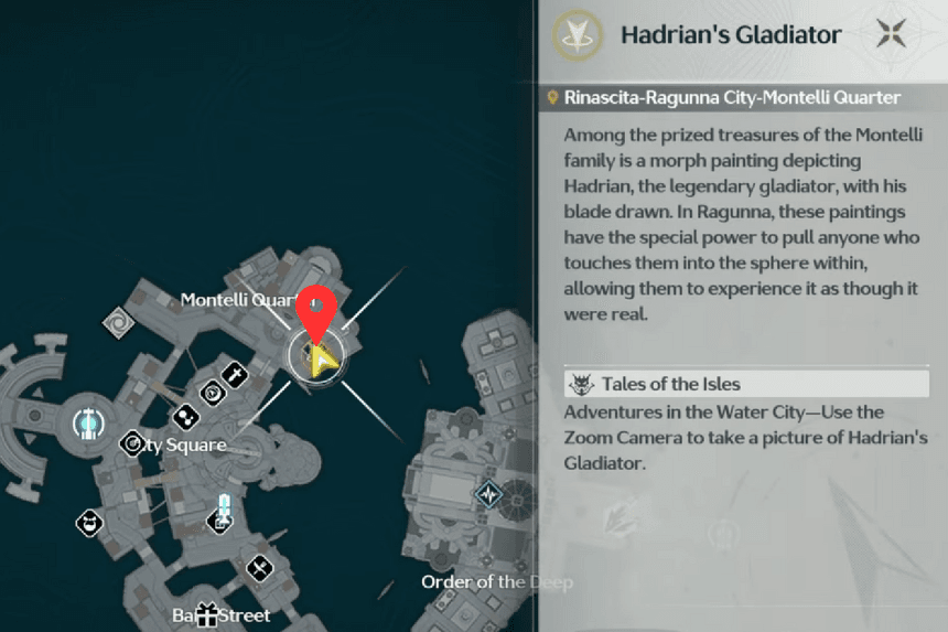 In the Montelli Quarters, you can find the Hadrian Gladiator near the docks on the right side. Instead of going into the quarters, explore the area to the right and head down towards the docks. There, you’ll spot a gladiator named Echo depicted in a painting. Take a picture of it to add to your ‘Adventure in Water City’ collection.