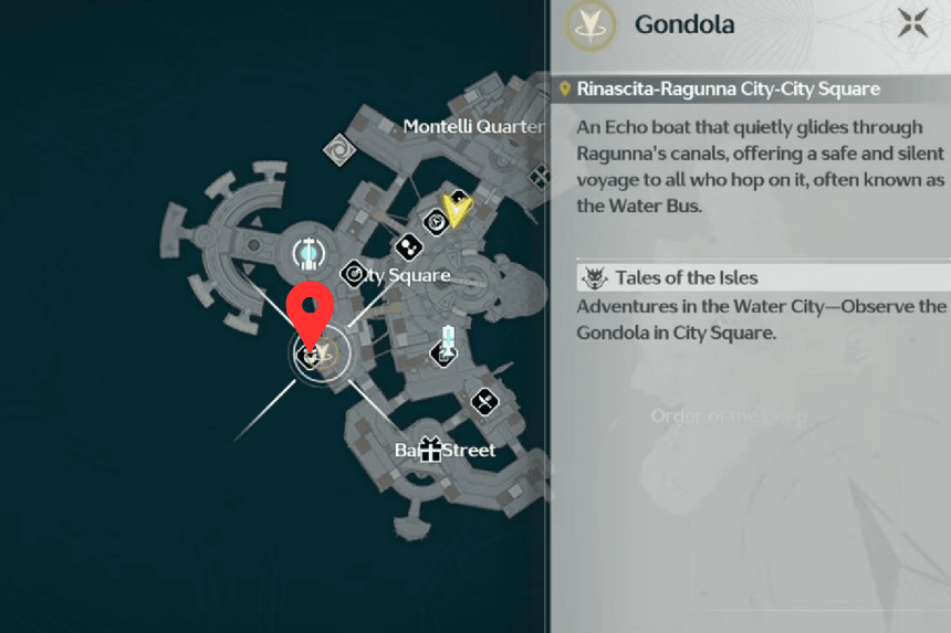 The Gondola Market is marked on your map with a grocery symbol. To find it, turn right just before you reach the entrance to the City Square and then continue walking towards the edge of the city. You’ll spot a large Echo Gondola there. Interact with it to add it to your collection.