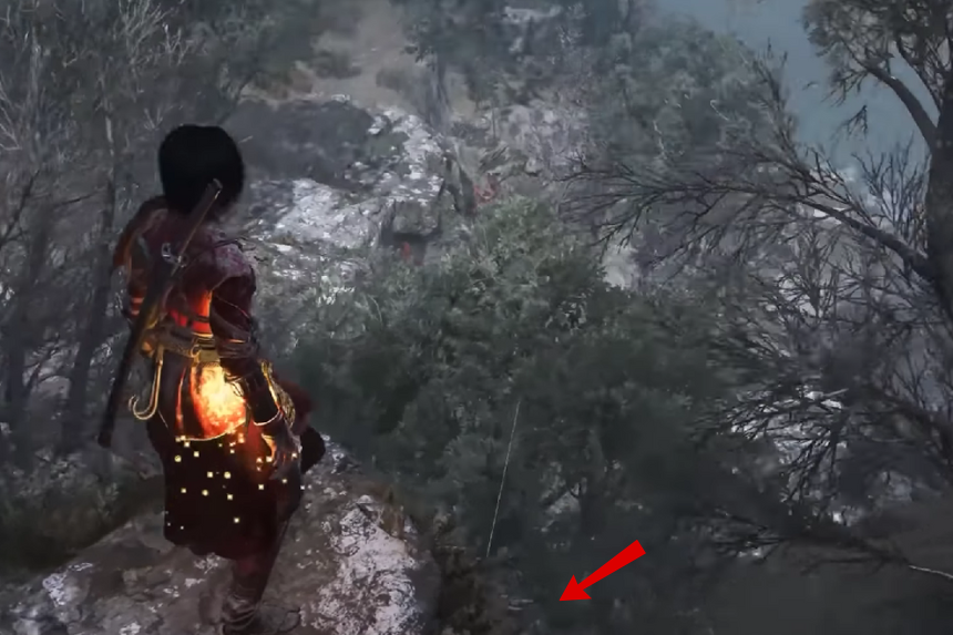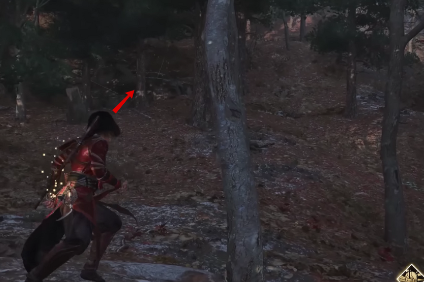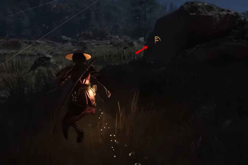 After meeting with Kinu and Kane in the Omi region in Mount Hiei, you need to move towards the east. Here, you will find a water body. In between the water body, you will find the Riddle of the Vault on a rock.