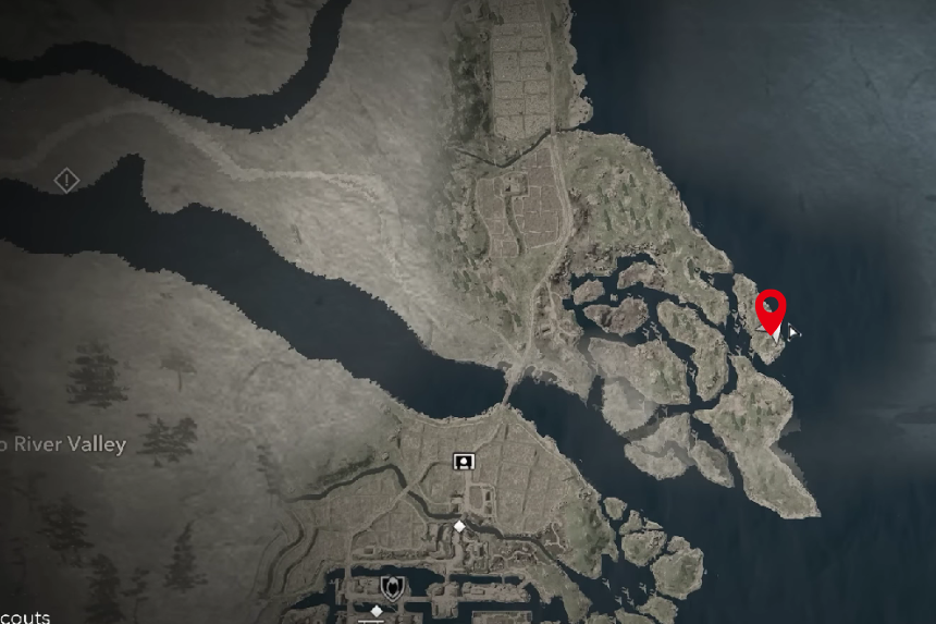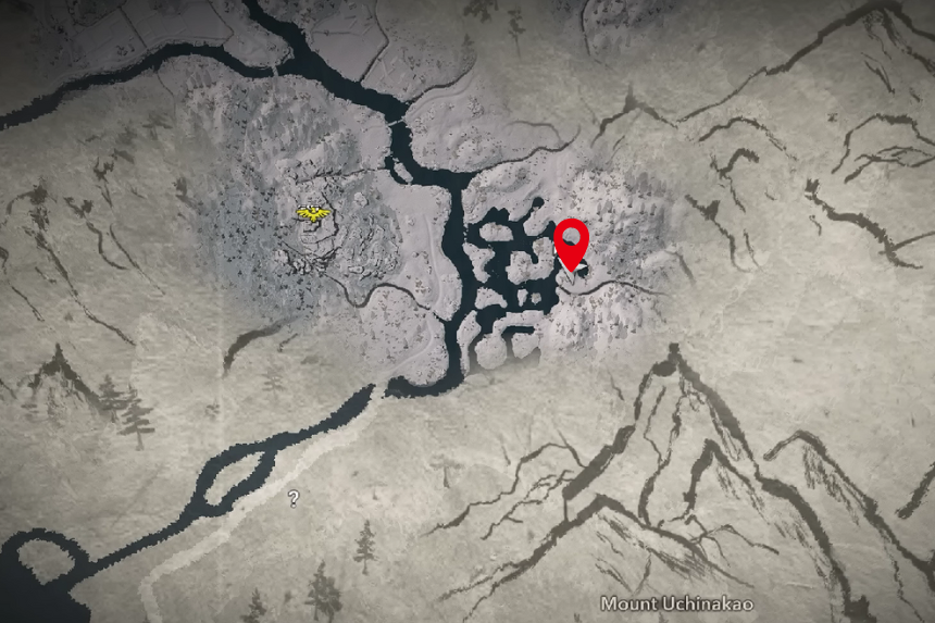 Go towards the south of Hikidan-Jo Ruins fast travel point, in Mount Uchinakao of the Wakasha region. You will find a river. At the edge of the river, you will find the Riddle of the River on a rock near some trees.