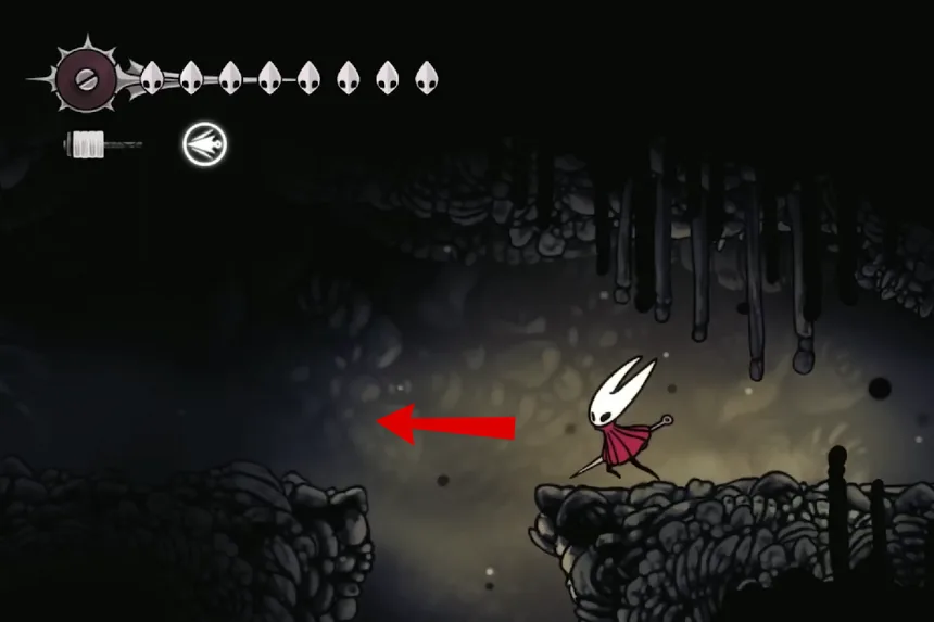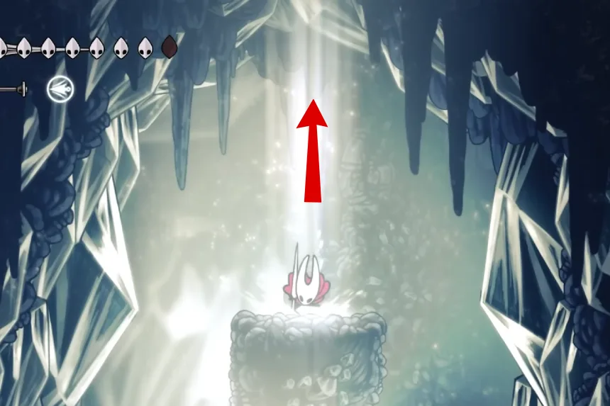 Just below the shortcut that uses a Simple Key, you’ll find this shard. You also need the Dash ability. Drop into the water below, strike the wall on the right, and you’ll reveal a hidden room with the shard.