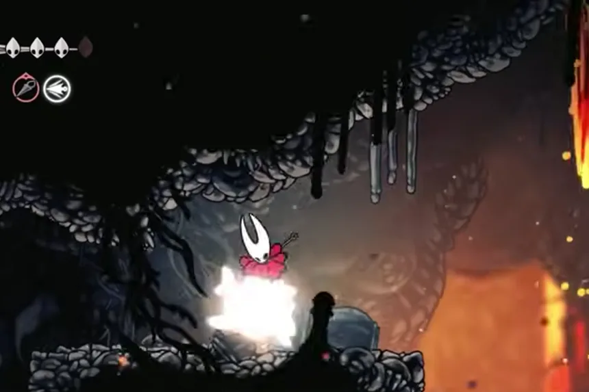 First, defeat the Widow to get the Needolin, which lets you access this area. Use the teleporter to reach the lower level, then climb and pogo across spikes and lava until you reach a high ledge. From there, jump and pogo up to the shard.