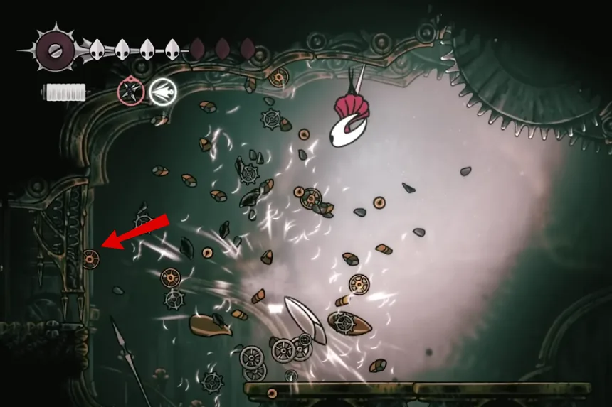 This shard requires the Apostate Key. From the Broodmother boss room, head right and unlock the central door. Use the spinning traps like trampolines to bounce your way up. Wall jump and pogo carefully until you reach the shard on the opposite ledge.