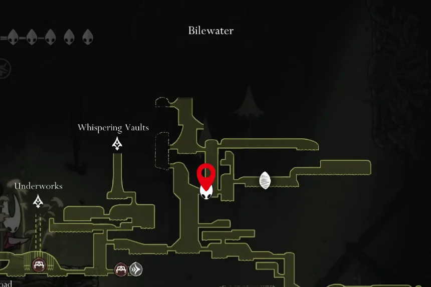 From the center of the Bilewater map, head midway up the main shaft, then go right. Instead of heading to the bench, cross the spikes and climb the wooden structures. Use wall climbs and grapples to reach the shard at the very top-right.