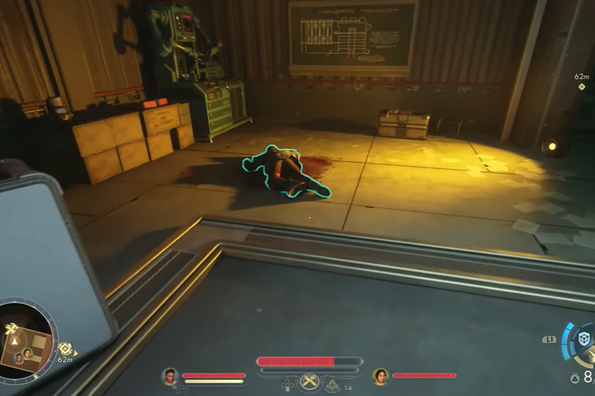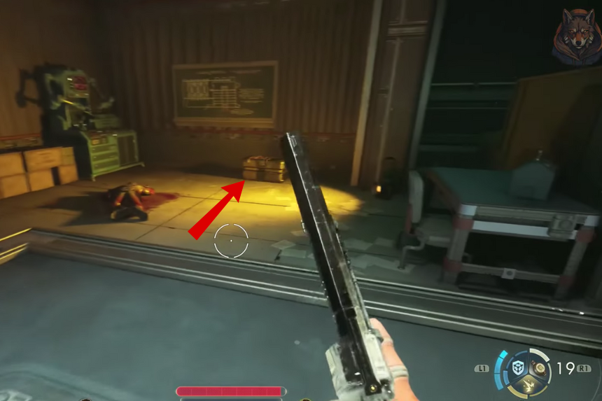 When you first enter the building, head down into the lower levels. You will come across a Raptidon Hunter near a workbench. There’s also a locked door on your left that leads deeper into the facility. You can either lockpick it or use the key found on the body under the Raptidon. A second Raptidon will drop from the ceiling as you fight the first one. They’re not too tough, but both can turn invisible, so stay alert.