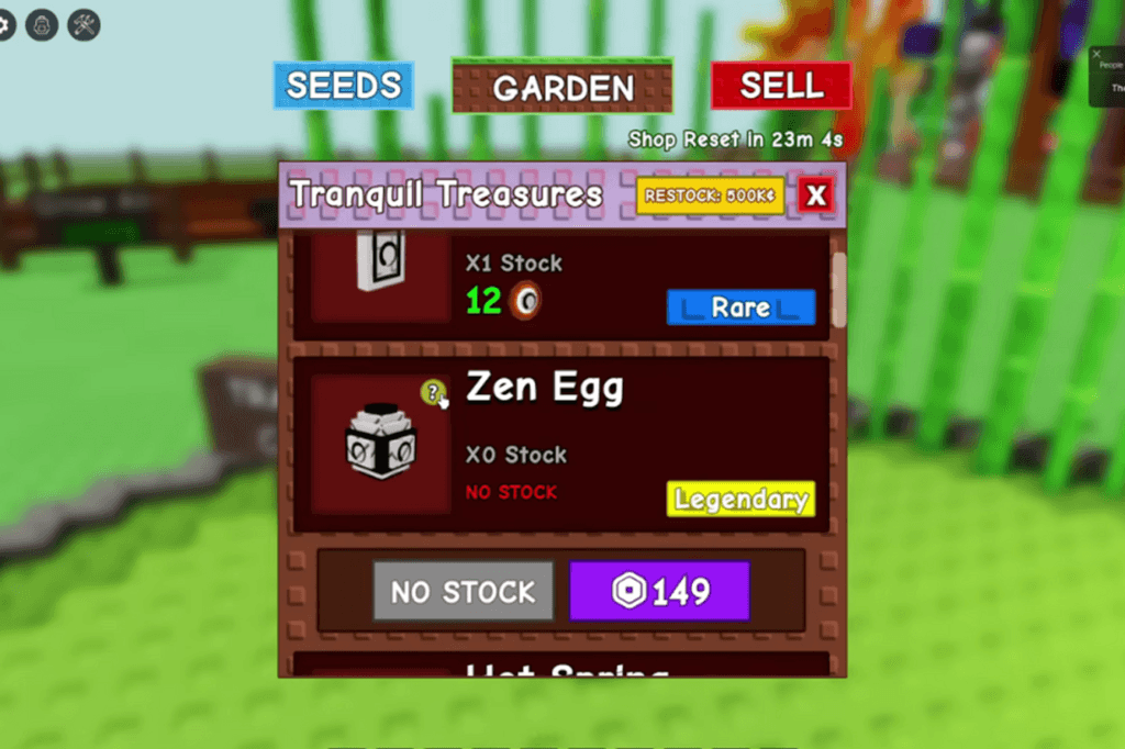 Another way to get Zen Eggs is through the Zen Shop. If you’ve saved up enough Chi points, talk to the Brown Raccoon (Tanuki) NPC standing next to the Monk in the middle of the map. You can purchase Zen Eggs straight from the Zen Shop for 30 Chi apiece, or for 149 Robux if you’d rather.