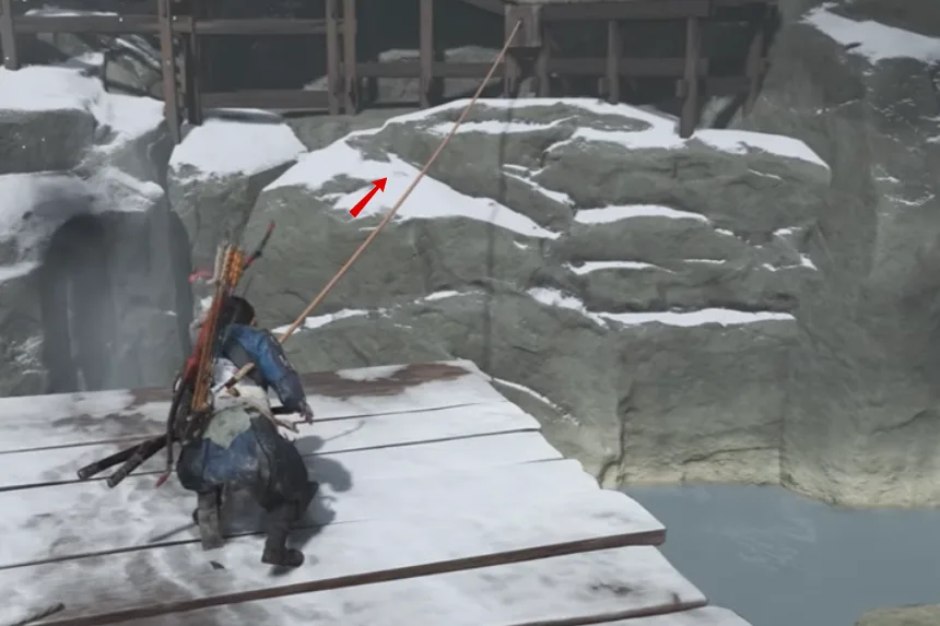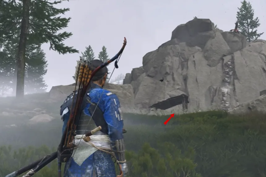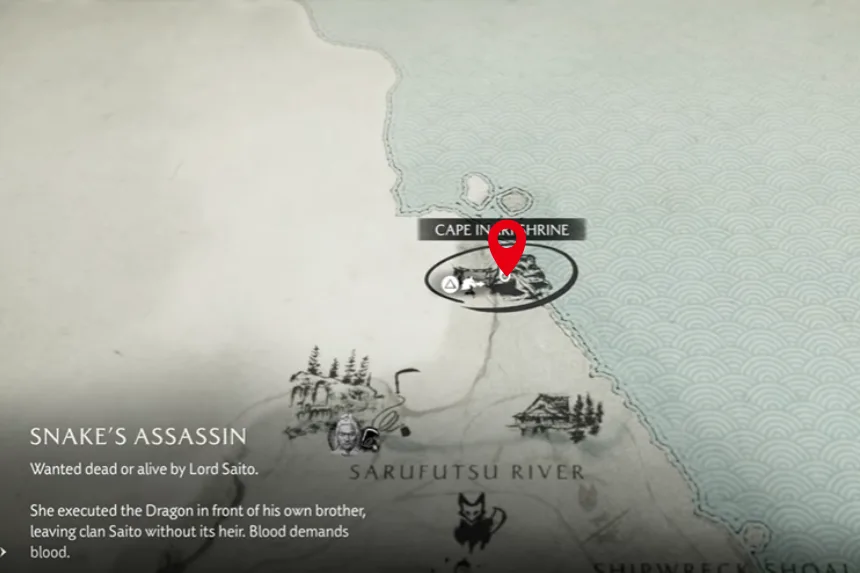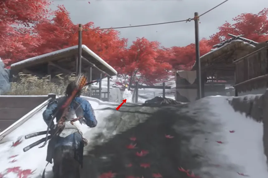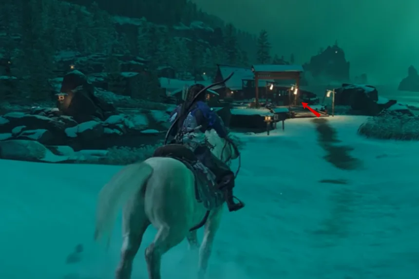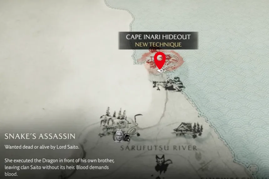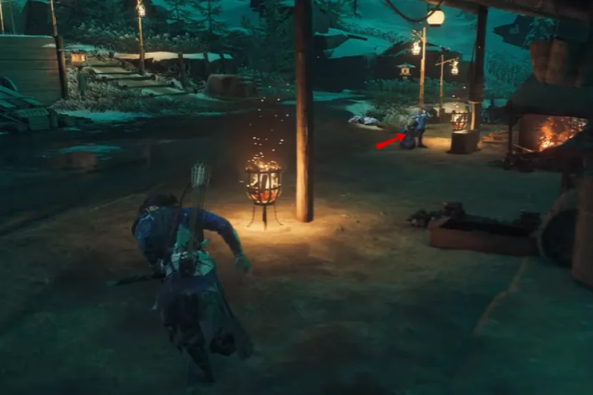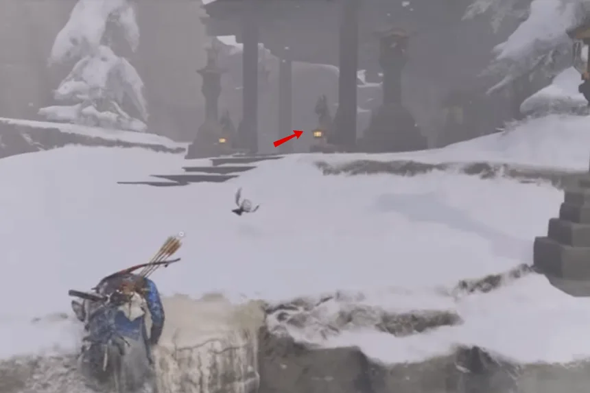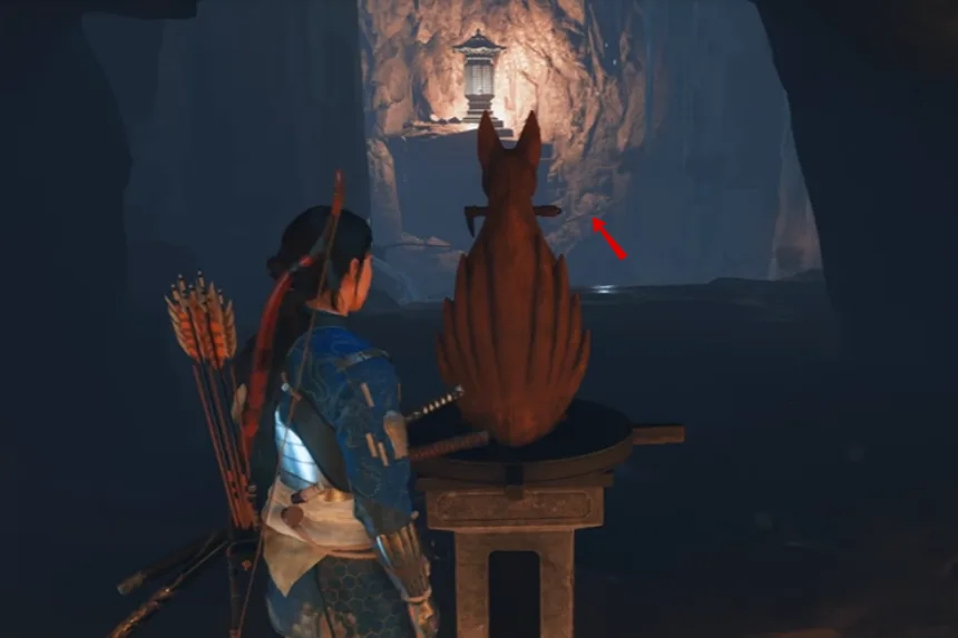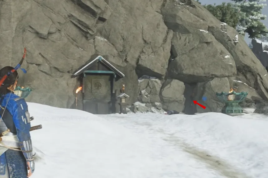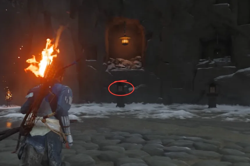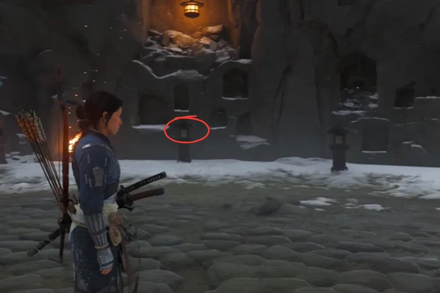 Reach the location marked on the map above, and you will find a hidden camp. To get to the hidden camp, you need to enter “Cape Inari Shrine”. First, you need to open the gate. You will find a blue symbol on the wall on the right side. Squeeze through the gap. Inside, you will find a fox lantern. Light the fox lantern inside and move out of the gap. Then, squeeze through the other gap on the left and light that fox too.