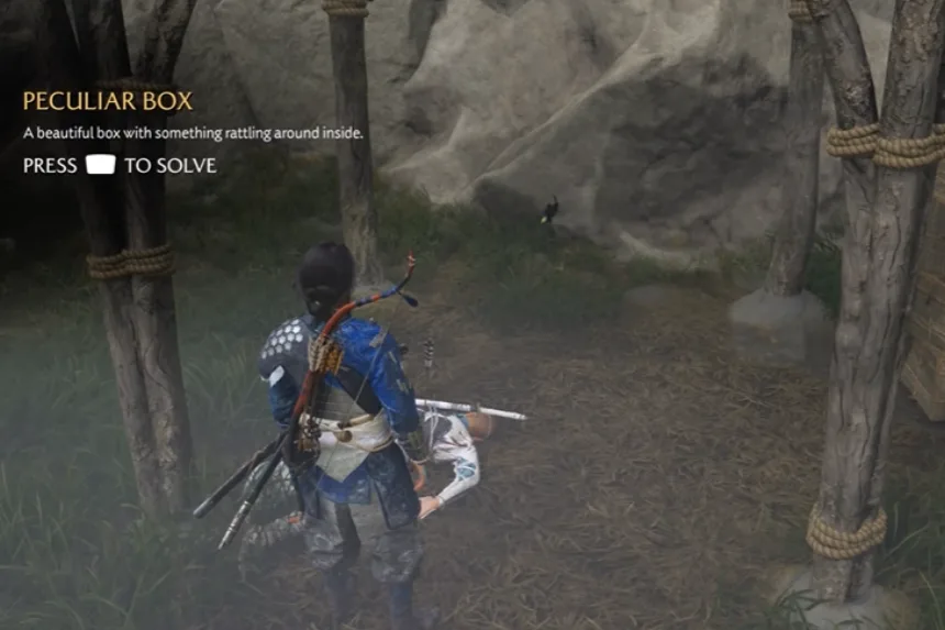 This puzzle box is in Sakura Woods. It’s on the ground, held by a dead enemy under a wooden structure. Once you reach the above marked location, clear out the enemies first. Then look for the dead body to find the Peculiar Box.