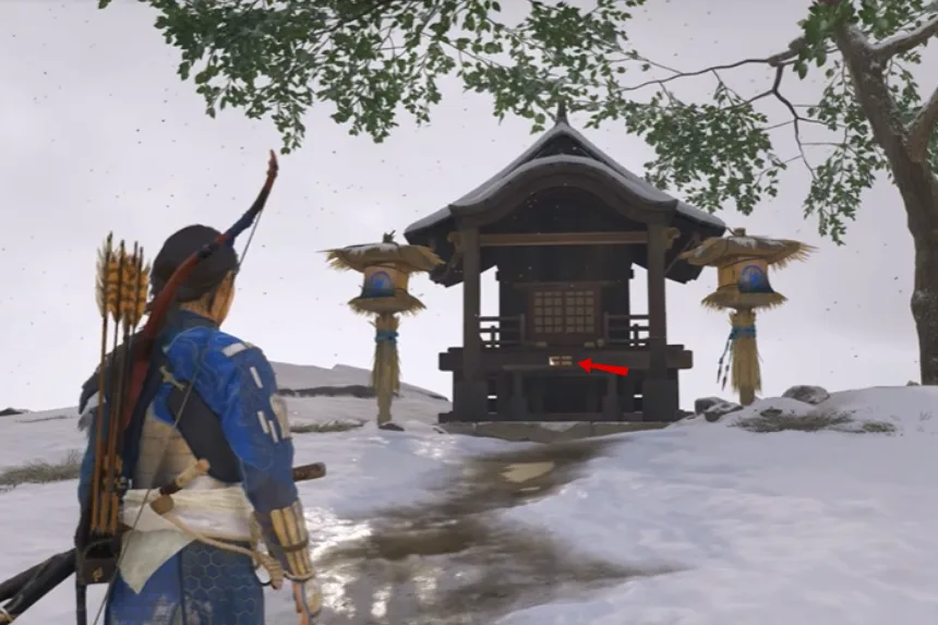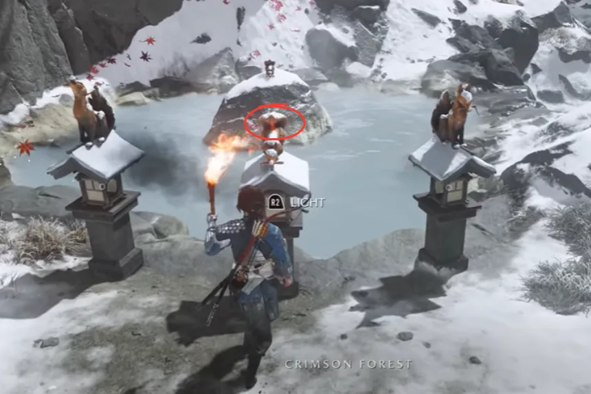 To find the Devious Box, head towards the Crimson Forest. You need to enter the Snow Drift Springs Shrine to reach the hidden camp. The shrine door is locked; you will need to light the right three fox statues with a torch.