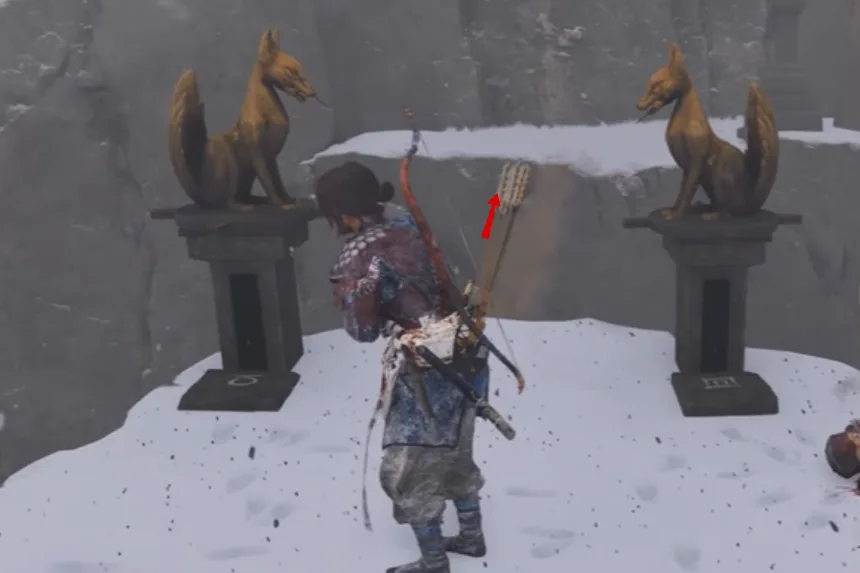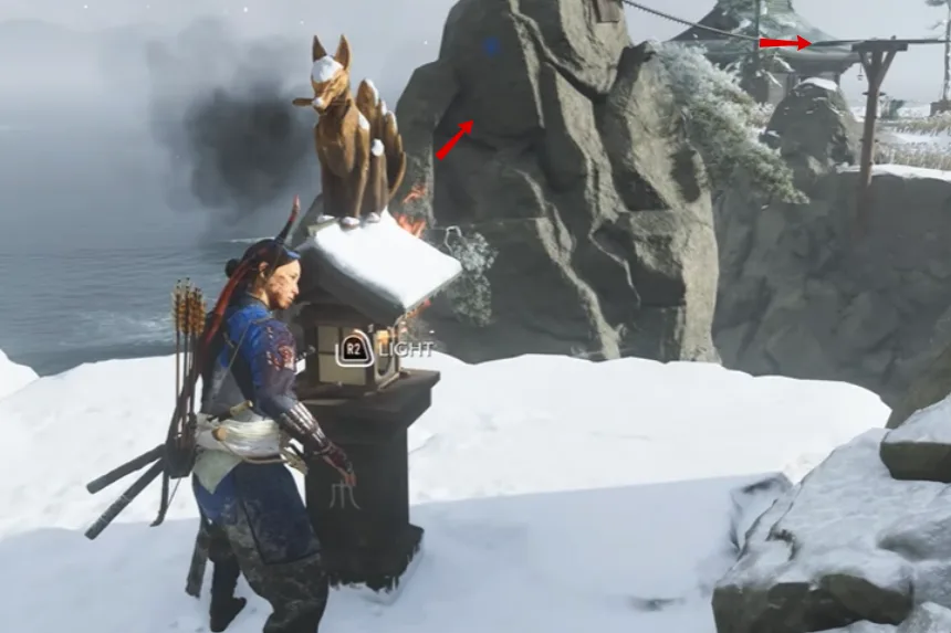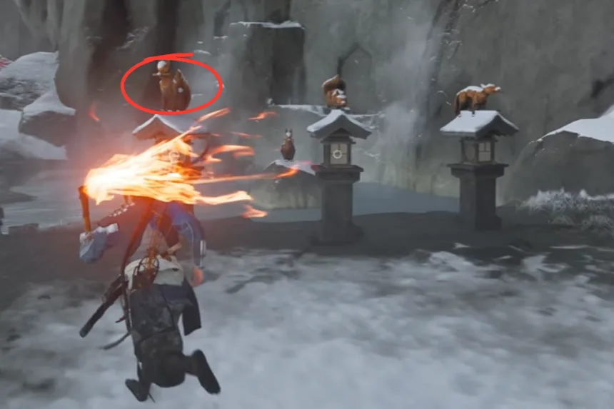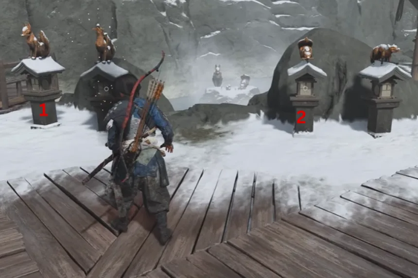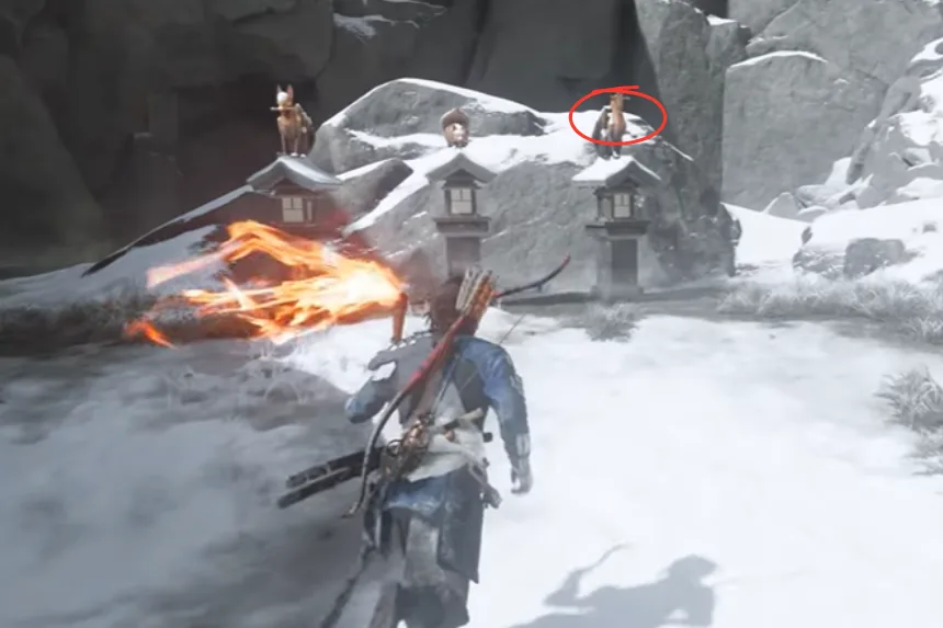 Now, you need to move to the opposite set of statues. Here, you will find three fox statues. You need to light the rightmost fox (the fox is facing up with a stick in its mouth).