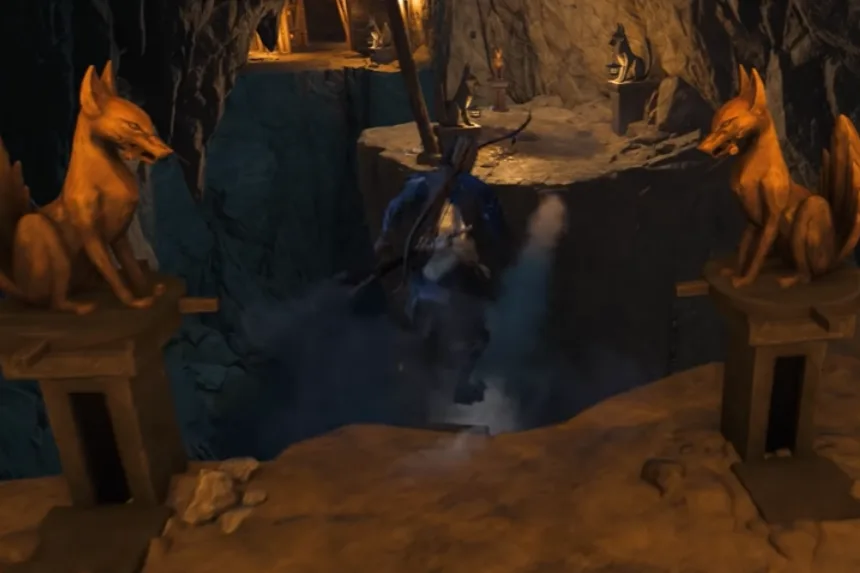 Inside, you will find more fox statues on the way. Rotate the statues to spawn the rope to move forward. Go through the ropes to exit the cave and reach the camp.