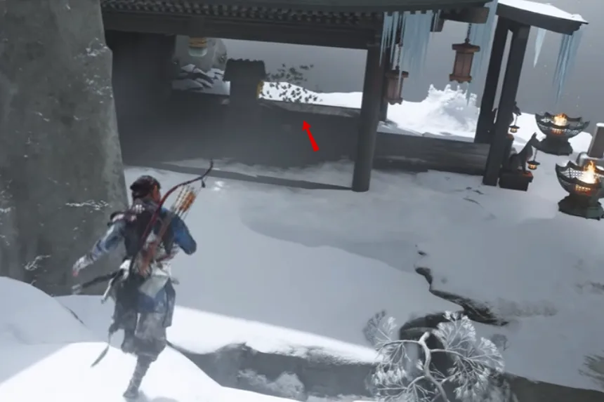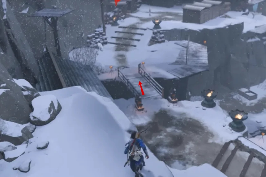 Now, you will hear a clicking noise. This opens a passage under the door. Inside, light two more fox lanterns, one on a cliff and the other inside a building. That unlocks a rope you can cross.