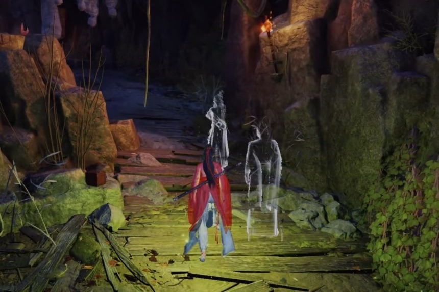 To finish the antique, interact with the coffin along the main path to teleport to the second section of the dungeon. After exiting, take the wooden plank path on the left that was previously shot down with fire arrows. You’ll soon find two ghosts, sense the echo and wait for their full conversation to end. Once the dialogue finishes, the Silver Longevity Lock antique will be completed.