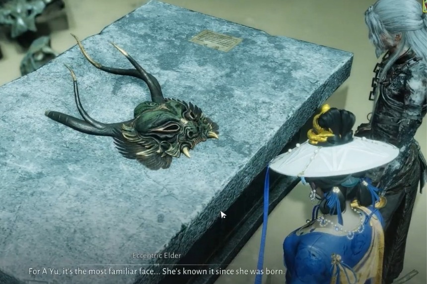 The Elder will tell you about A’Yu the fish, and the task of putting the Nuo Dance mask on her so that she becomes obedient. The task is pretty straightforward since A’Yu isn’t much of a hassle. Once you complete the task, the Red Fish Sword antique will be yours.
