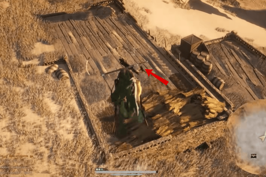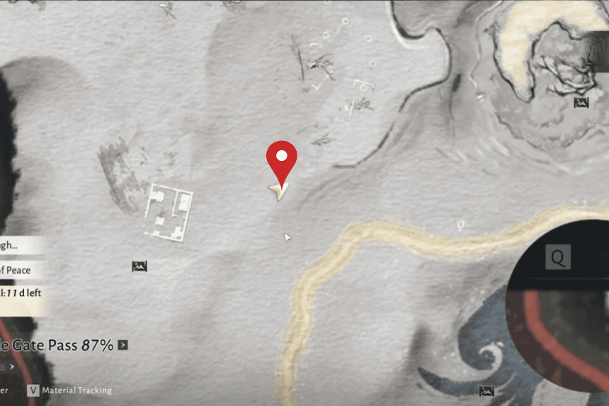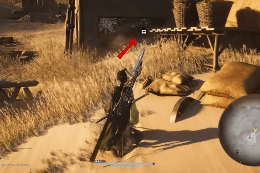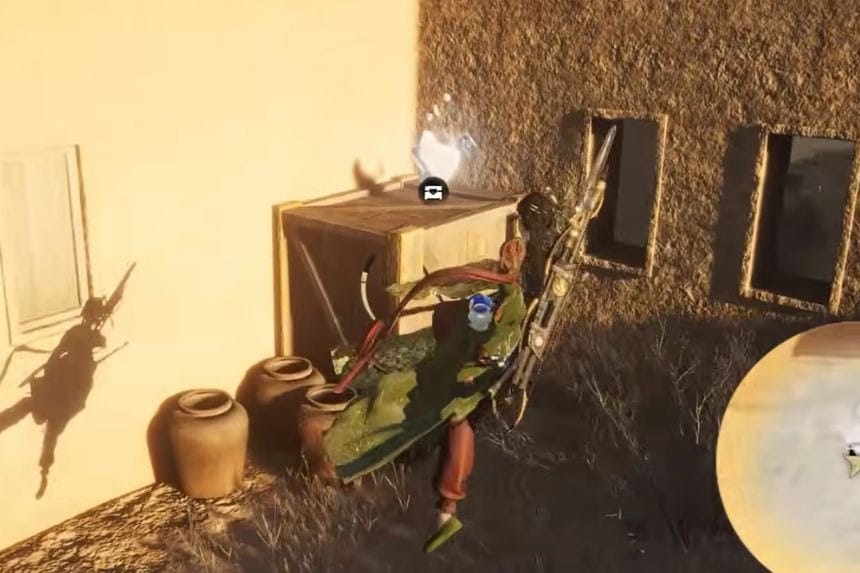 Go towards the big building and you will find the chest on the west side of it. The chest is hidden in the sand. So, interact with it to get the rewards.