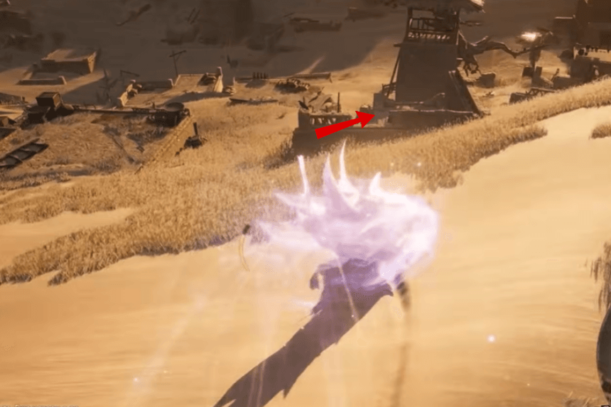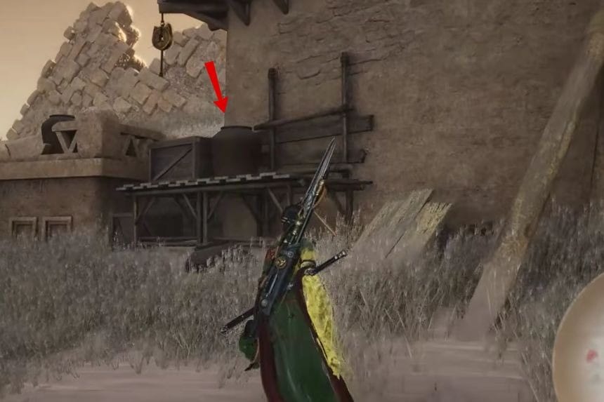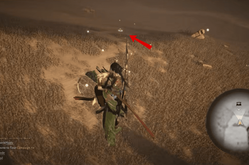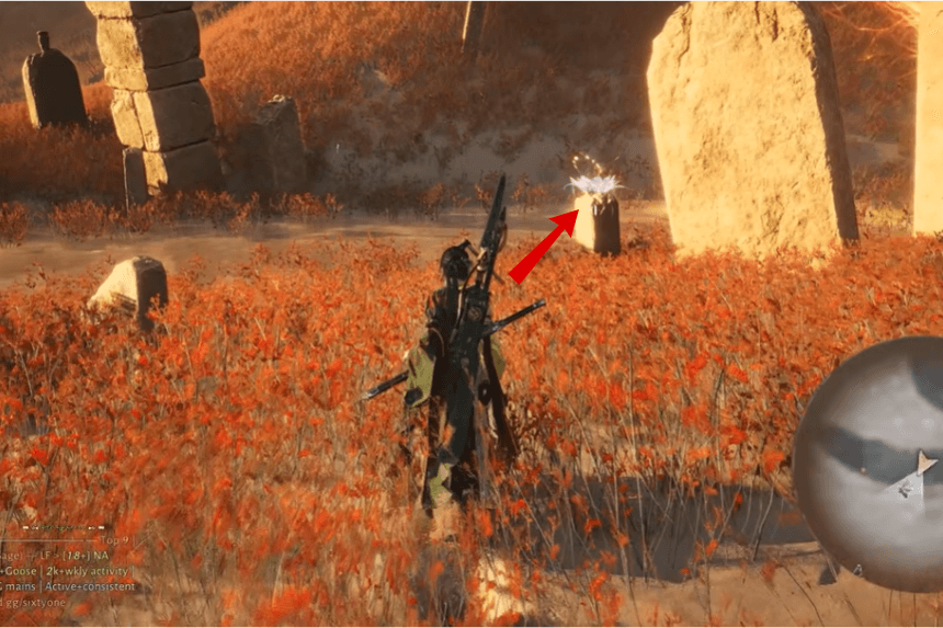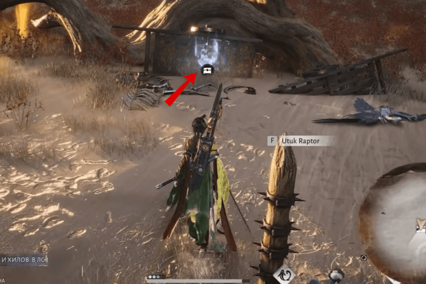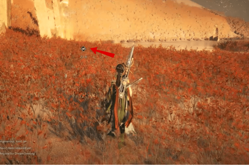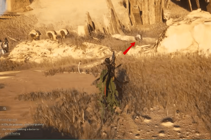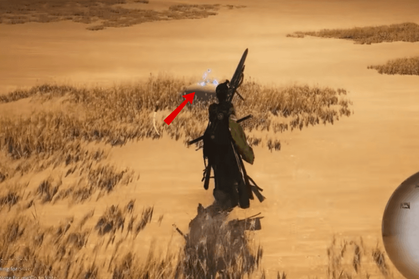From the camp, go towards the broken building. When you reach the red grass area, you will find the chest buried in the ground. Interact with it to unlock the chest and collect your rewards.