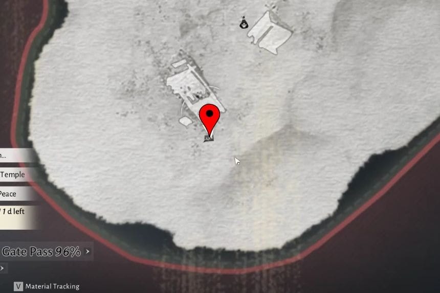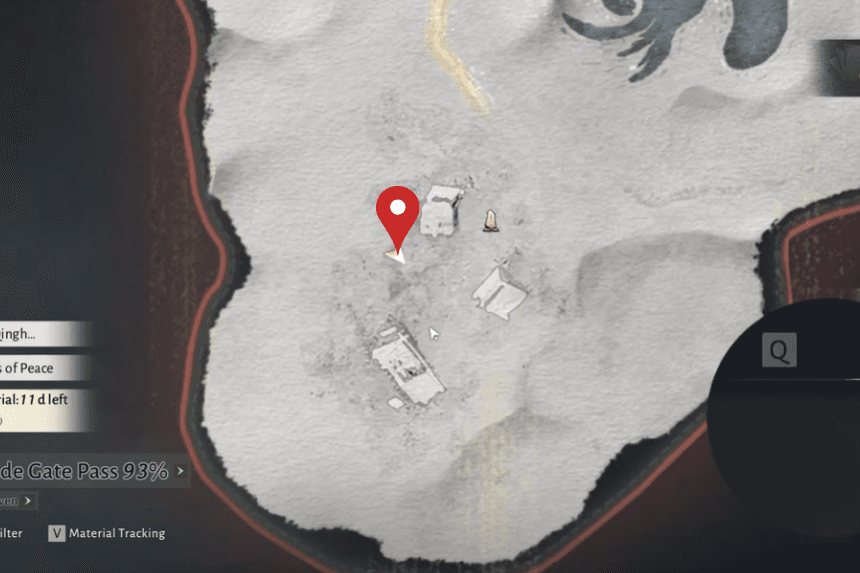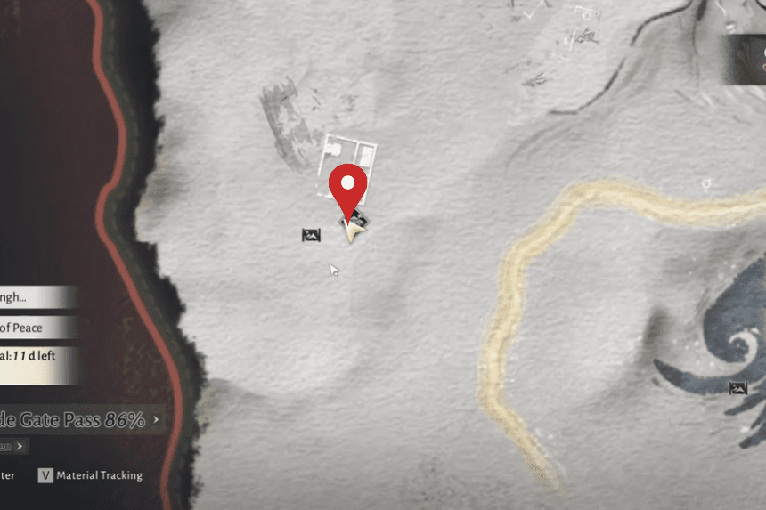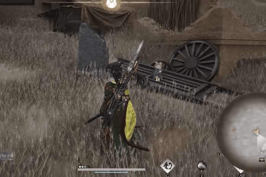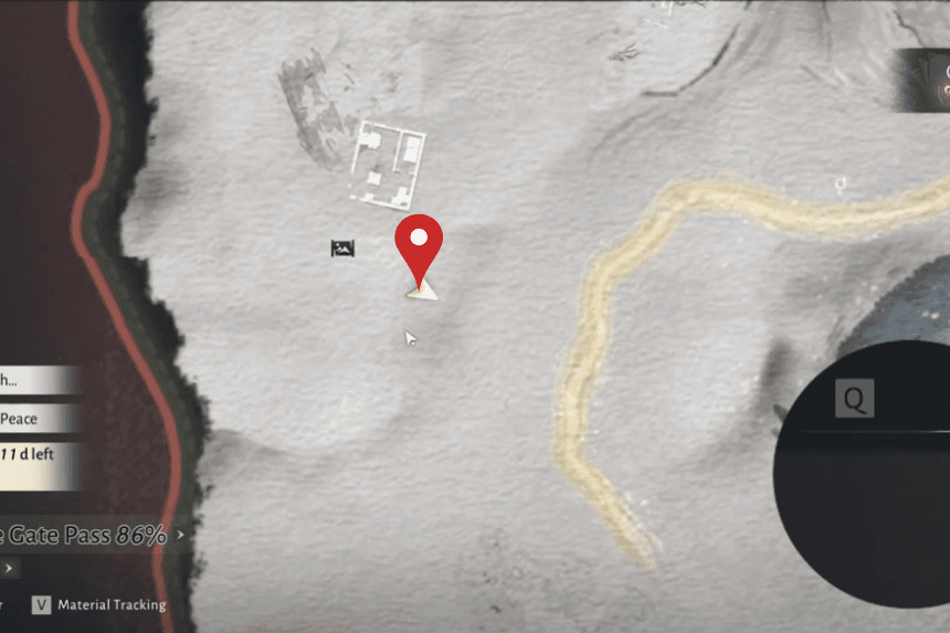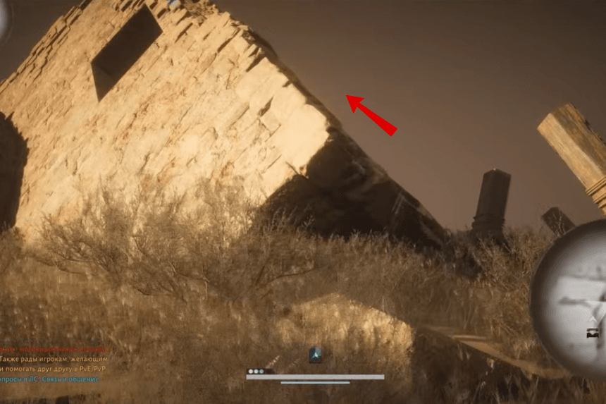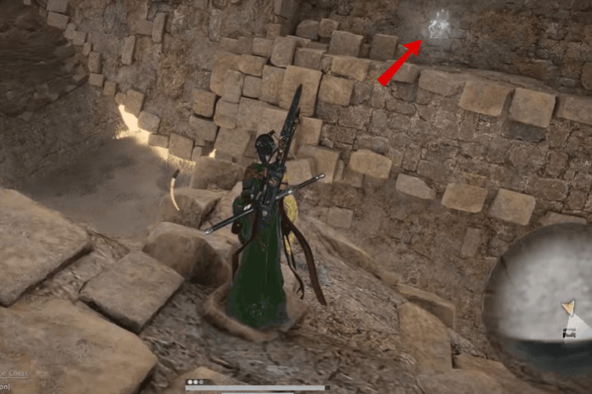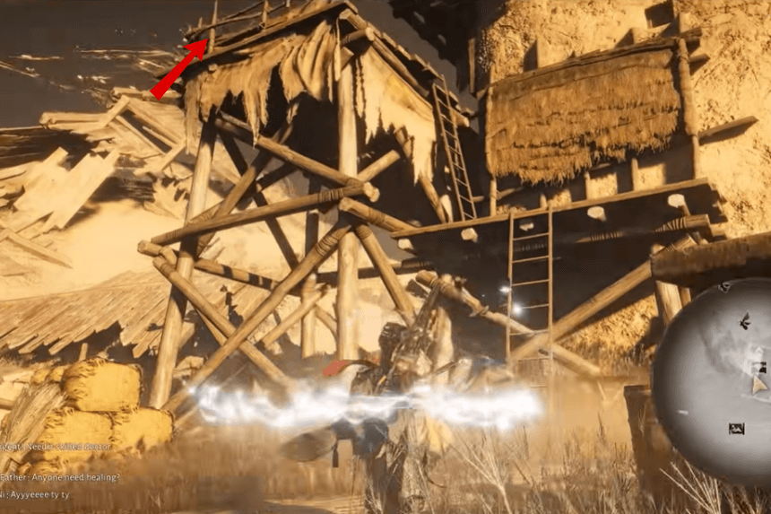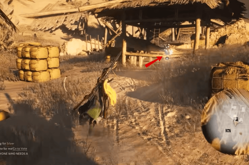 From the camp, go towards the broken building. When you reach the red grass area, you will find the chest buried in the ground. Interact with it to unlock the chest and collect your rewards.