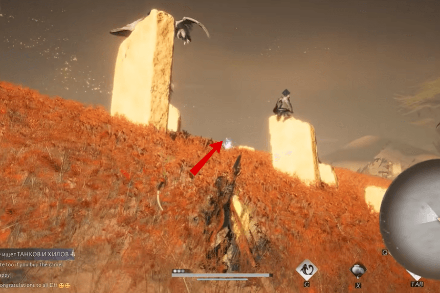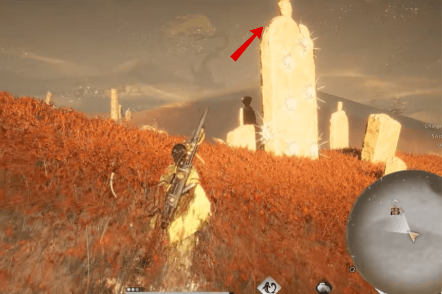 Near the pillars you will find the walking treasure in the red grasses. Block its path to collect your rewards.