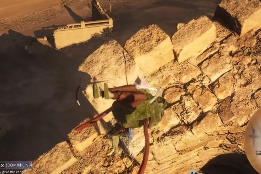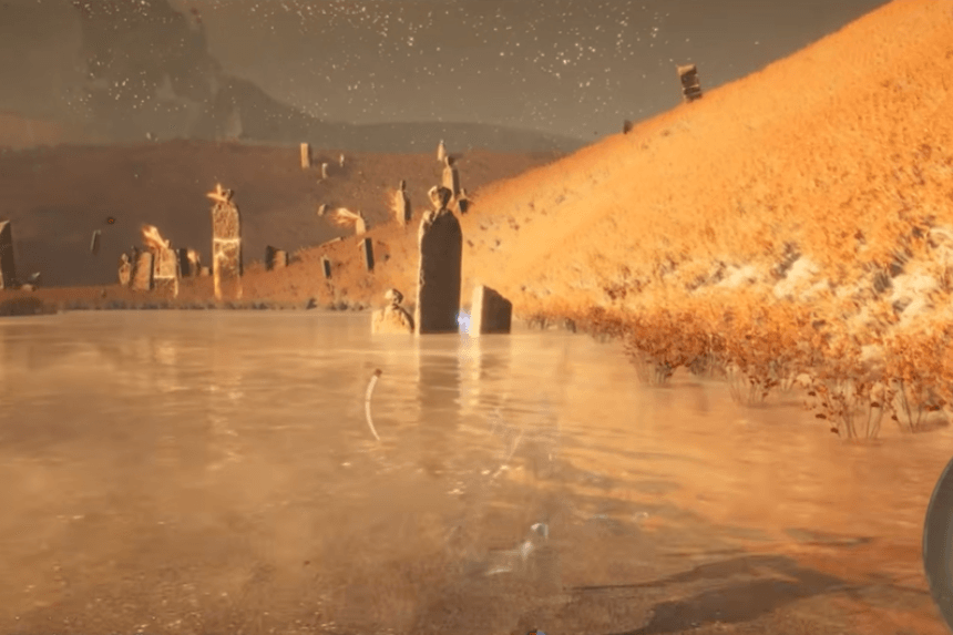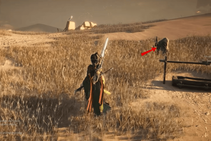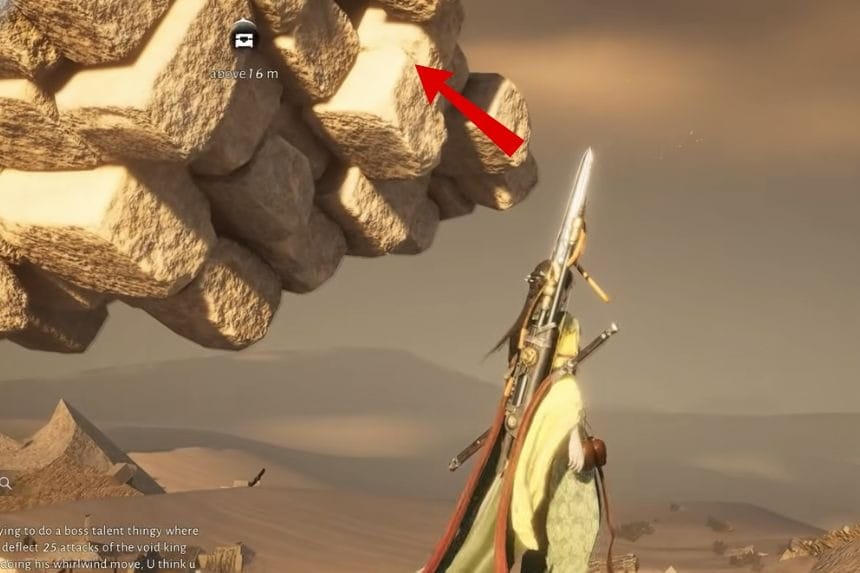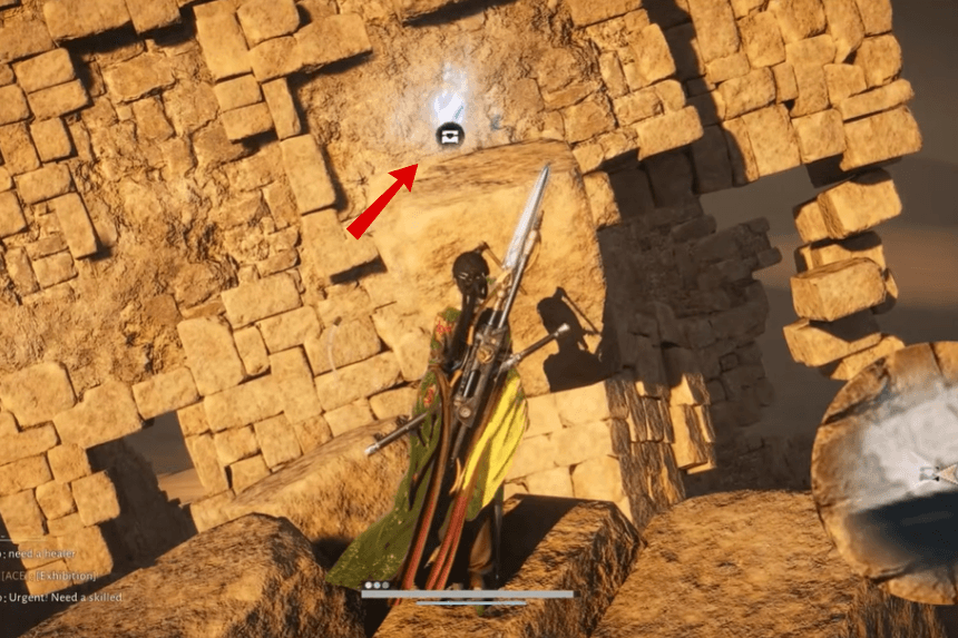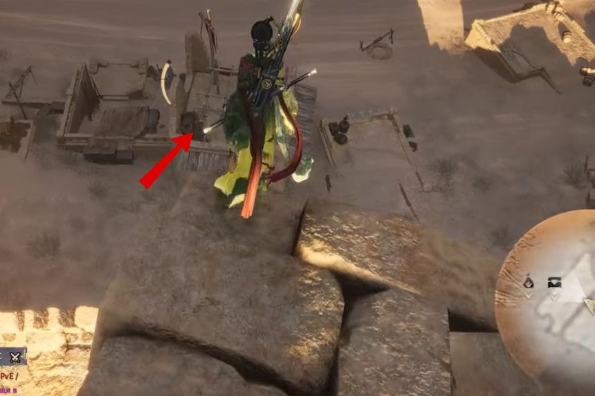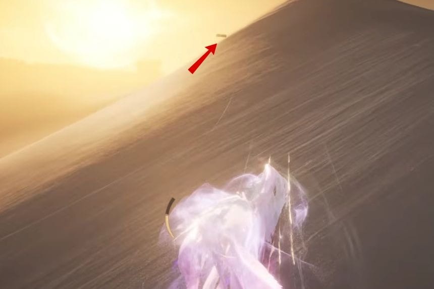 Climb the tallest pillar in the middle of the desert near the lake to find the chest on top of it. Interact with it to collect the rewards. There will be enemies nearby, so kill them all before you climb up the pillar.