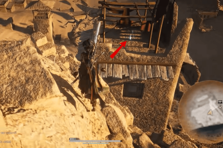 Enter the village area in the desert to find the chest inside the building. Interact with the chest to collect the rewards. The building is just near the gate of the village area.