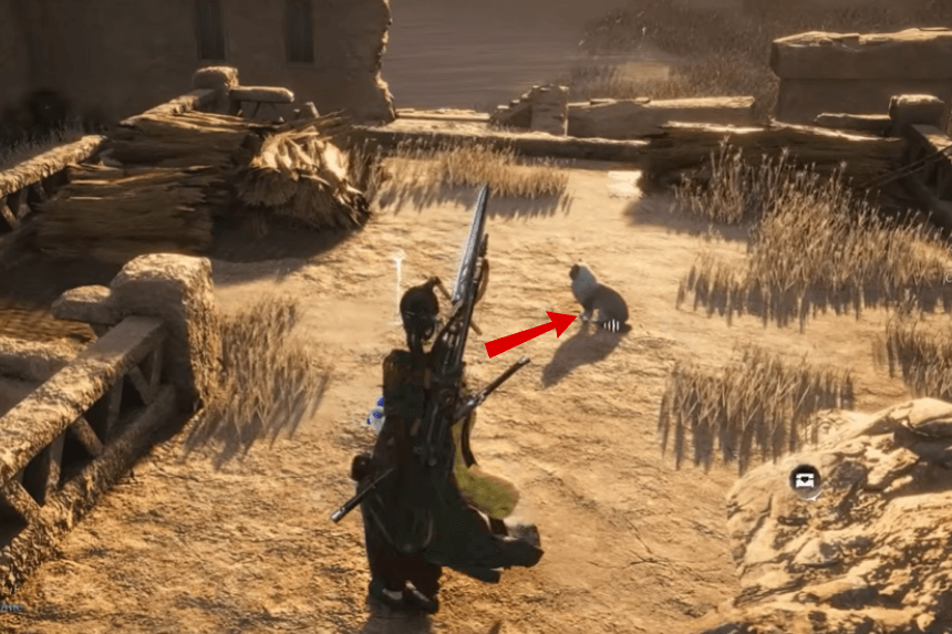 Go towards the east of the lake to find the oddity roaming around in the desert. Block its path by interacting with the broken stones to capture it easily.