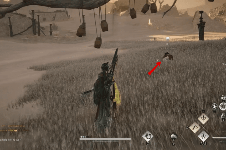 At the outskirts of the village, on the left side, there will be a tree. Between the village and the tree, you will find the chest. When you interact with it, it will show a glowing path in front of you. Following the path will lead you to a skeleton. Interact with it to collect the rewards.