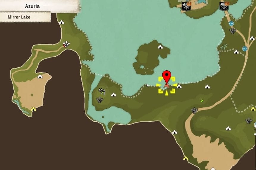 You will find it along the shoreline on the eastern side of Mirror Lake, just east of the southern entrance to Azuria Castle. Follow the water’s edge and check that stretch of shore carefully.