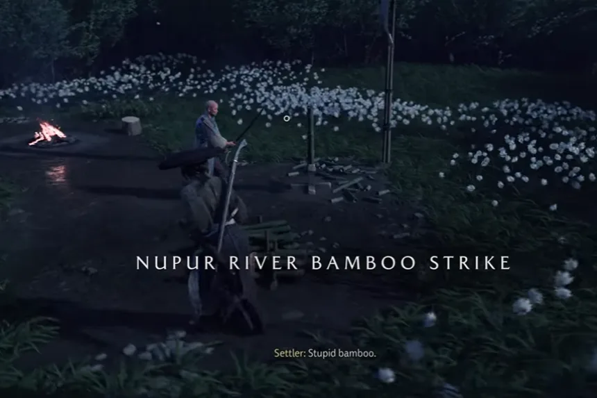This one is located west of the Nupur River and north of the Crow’s Nest Watch Tower. Reach the marked location and go towards the bushes. There is a hidden path inside the bushes. You need to crawl through the bushes to reach the other end. Here, you will find the Nupur River Bamboo Strike.