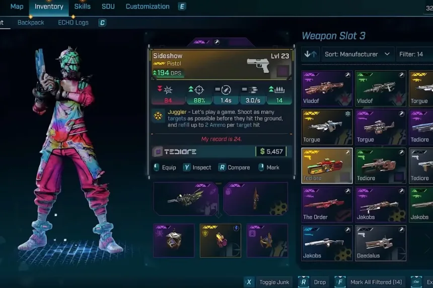 This legendary weapon features a unique juggler mechanic, where keeping items in the air refills your ammo. Additionally, each gunshot produces whimsical, carnival-like dink sounds, adding a playful twist to combat.