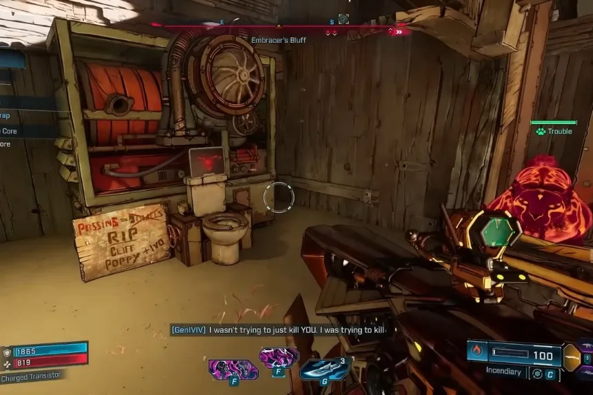 Genevieve, a boss from Borderlands 3, appears as a talking toilet in Embracer’s Bluff. During interactions with Clap Trap, she references past events and provides amusing, combat AI dialogue, highlighting the franchise’s irreverent humor.