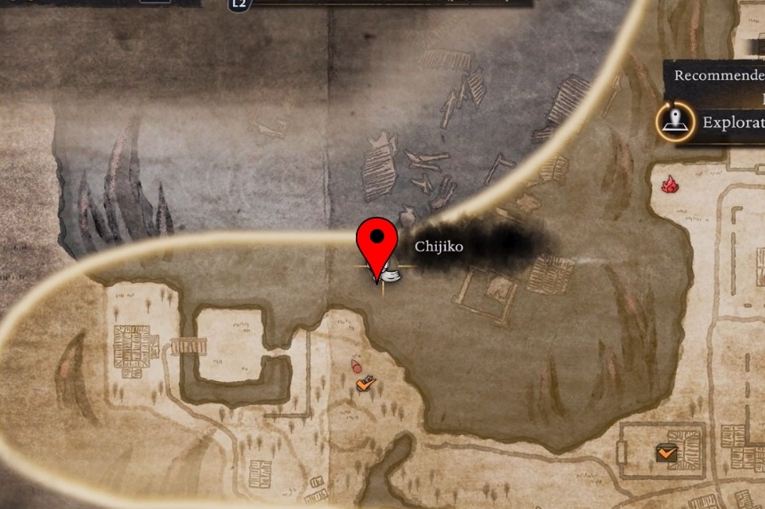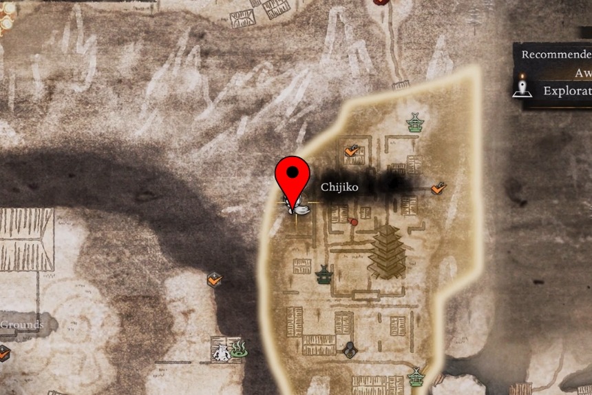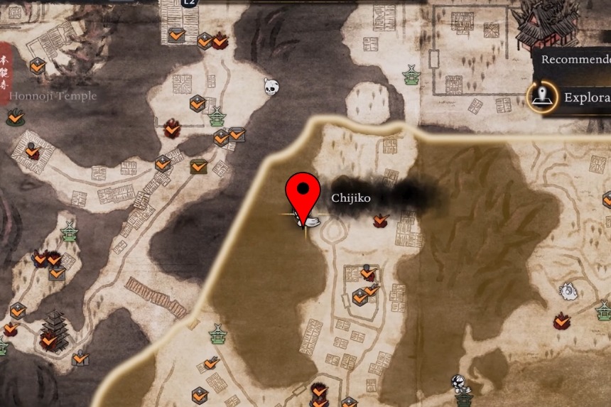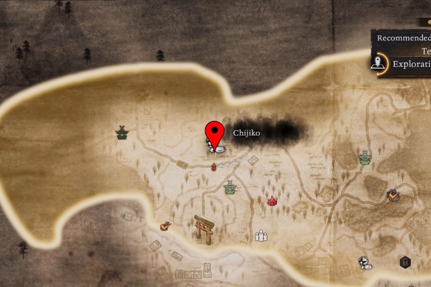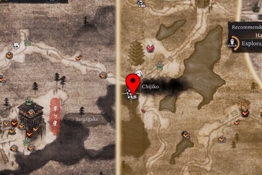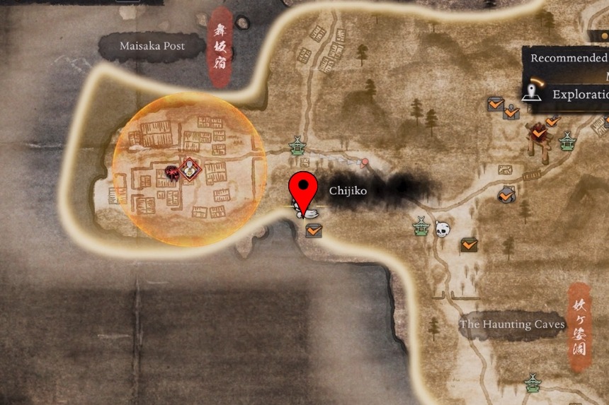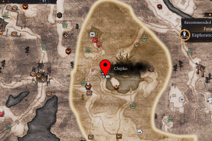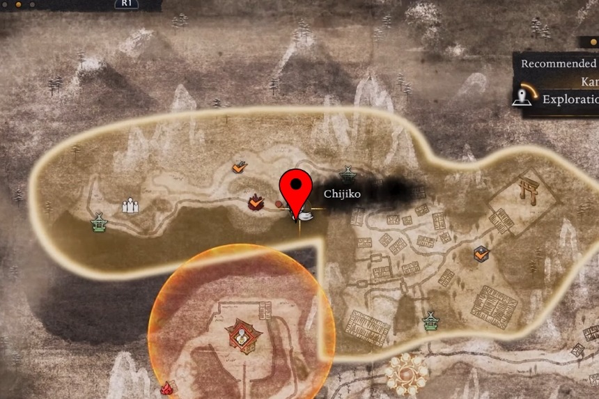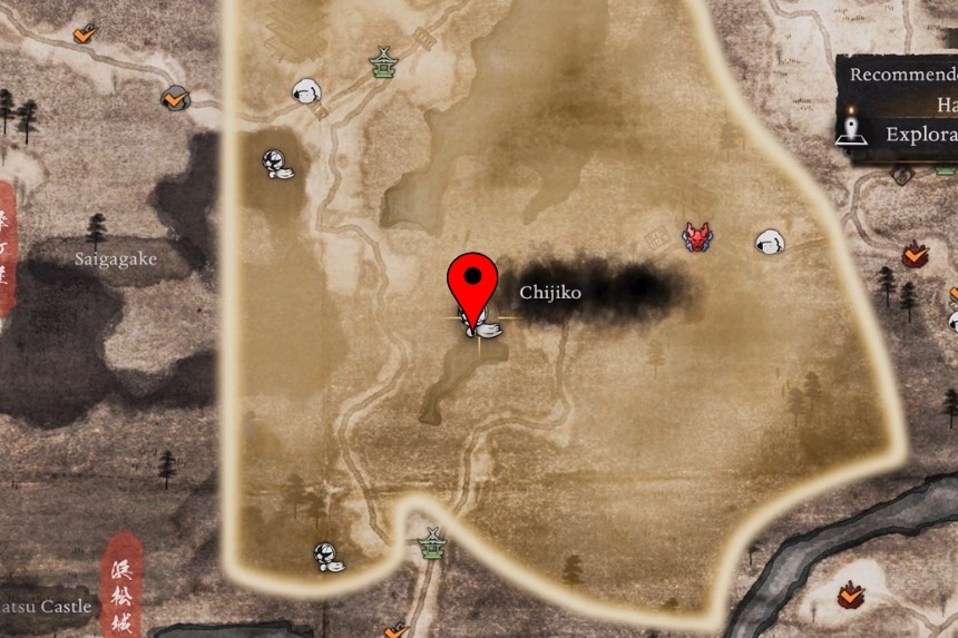 You will find this one west of the Maisaka Junction Shrine. From the shrine, head west into the woods and look up and you will spot the Chijiko flying in the sky. Because of the tall trees, it’s hard to aim from the ground. To get a clear shot, climb to the top of the nearby hill, close to the Chijiko’s map marker. From there, shoot it down, then pet the Chijiko after it lands. This will unlock Transformed Art – Leaping Strike (Fire) and reward you with 1 Ninja’s Locks.