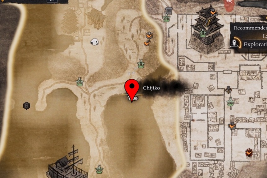 You can find the Chijiko by starting at the Filthy Flooded Streets Shrine. Move through the village and head toward the Rokuhara border. When you reach the bridge, look out toward the sea. You will spot the Chijiko floating in the distance above the water, close to some wreckage.