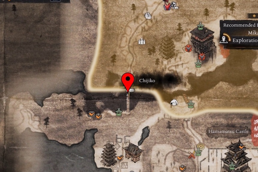 You will find this Chijiko on the western side of the Hachiman Shrine path if you’re coming from the Hamamatsu Castle area. As you walk along the path, look toward the cliffside – you will see it flying nearby. Shoot it down from the sky, then pet the Chijiko once it lands. Doing this unlocks Transformed Art – Sign of the Cross (Pierce) and rewards you with 1 Samurai’s Locks.