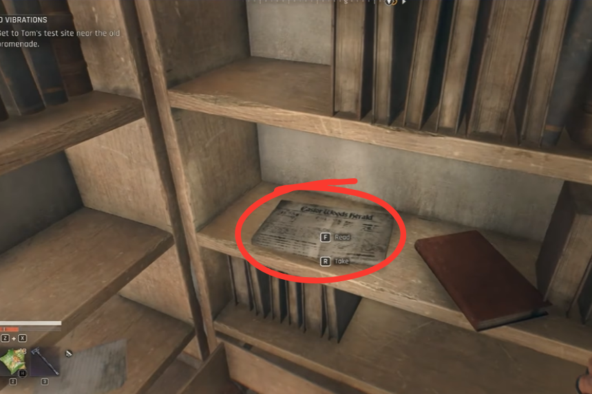 In the old town region, near the museum library, go inside the red brick shop. On the shelf, you will find the 1950 newspaper on a shelf, near the books.