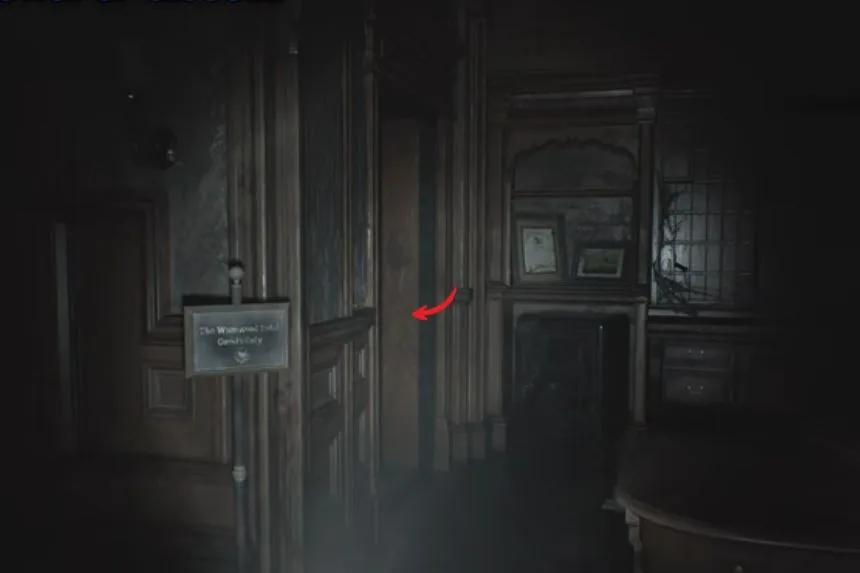 Once you use the Old Key to open the hotel door, head forward to a room with stairs leading upstairs. On the floor, you will find a paper, the Hotel Pamphlet, which contains useful information for your exploration.