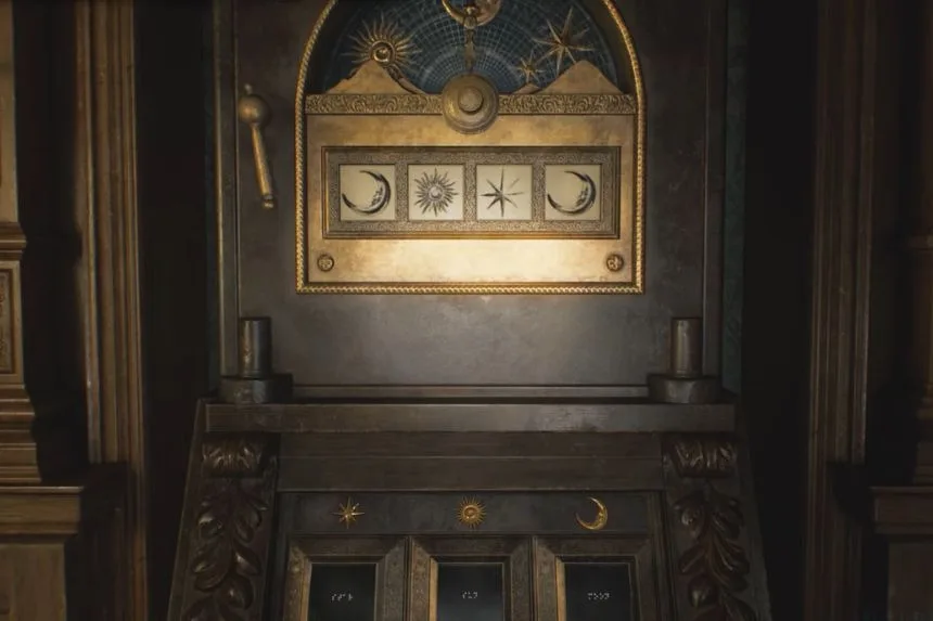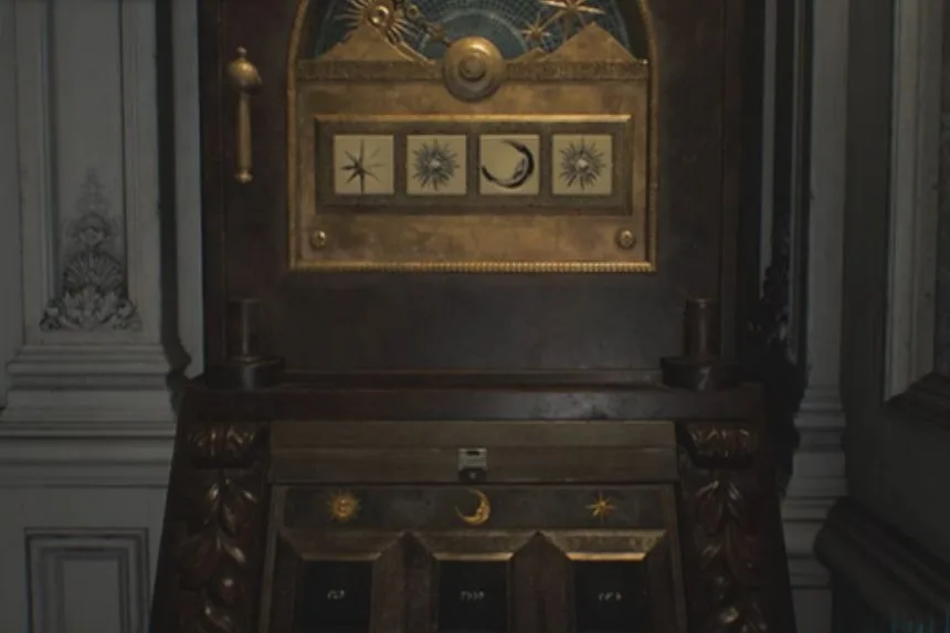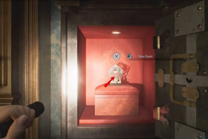 Still in the Chairman’s Office, interact with the puzzle safe to obtain the Moon Quartz. You’ll use this key item on the Quartz Door in the Central Hall. The solution for the puzzle is Moon – Sun – Star – Moon.