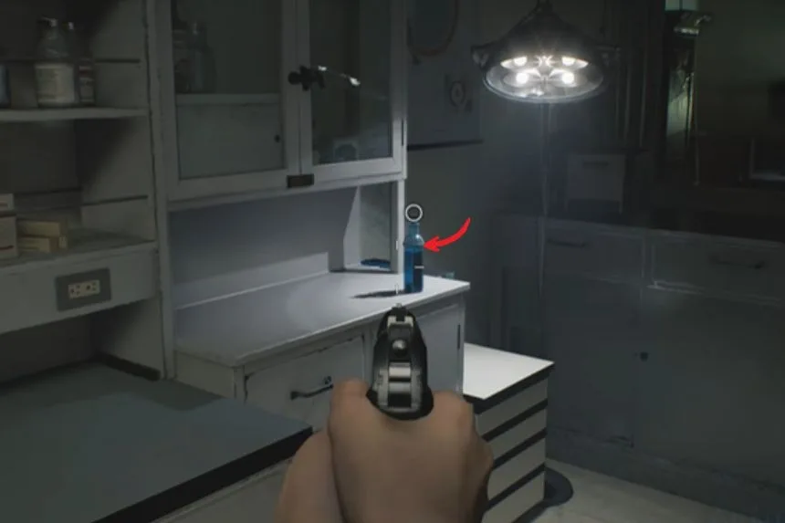 Also in the Conference Room, pick up the blue Corrosive bottle, which is a key item for unlocking locked puzzle boxes later.