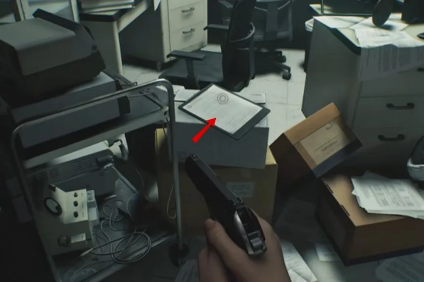 In the office area, go behind the reception desk and follow the path to the backroom. Open the blue drawer to find the Notice of Closure. This file gives you clues about the hotel’s operations and its history.